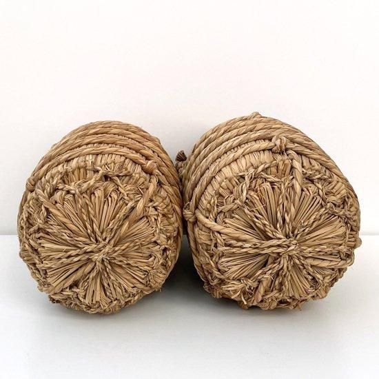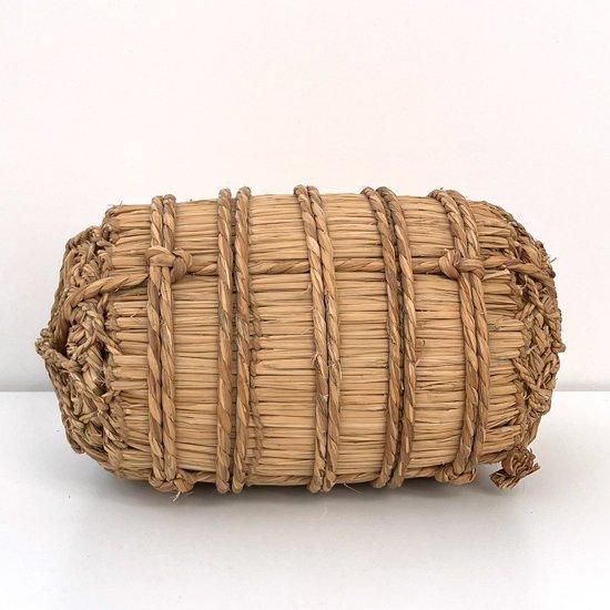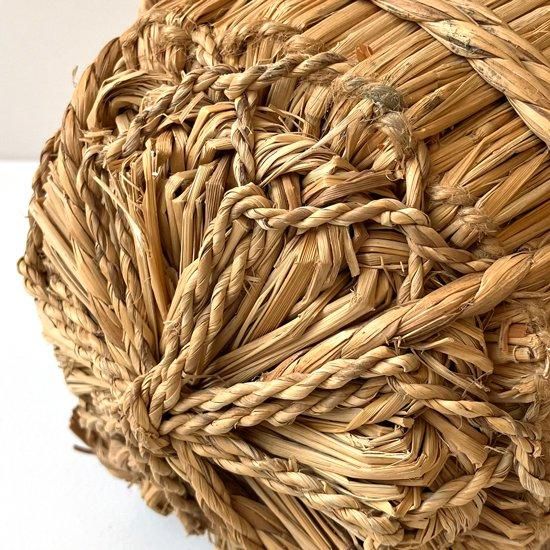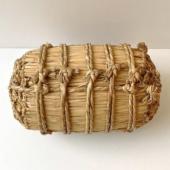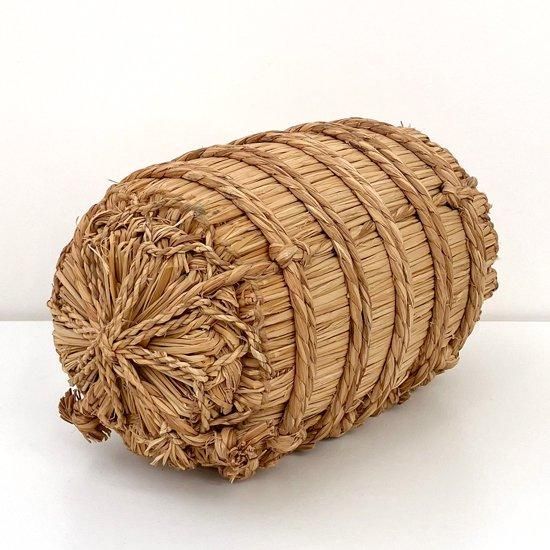 見慣れたものや既存のもののスケールが変わることによって、いつもと違ったディテールが見えてきたり、また別のものような、違った佇まいにみえてくる面白さがあります。この米俵もまた独特のフォルム、量感や藁の編み込みなどがどこか不思議な存在感です。