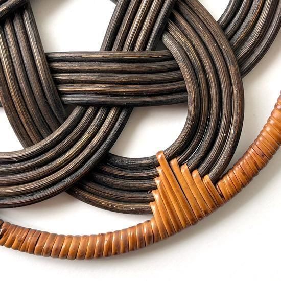 水引きのように梅を表現した造形で、染色した部分と籐のコントラストがグラフィカルなデザイン。